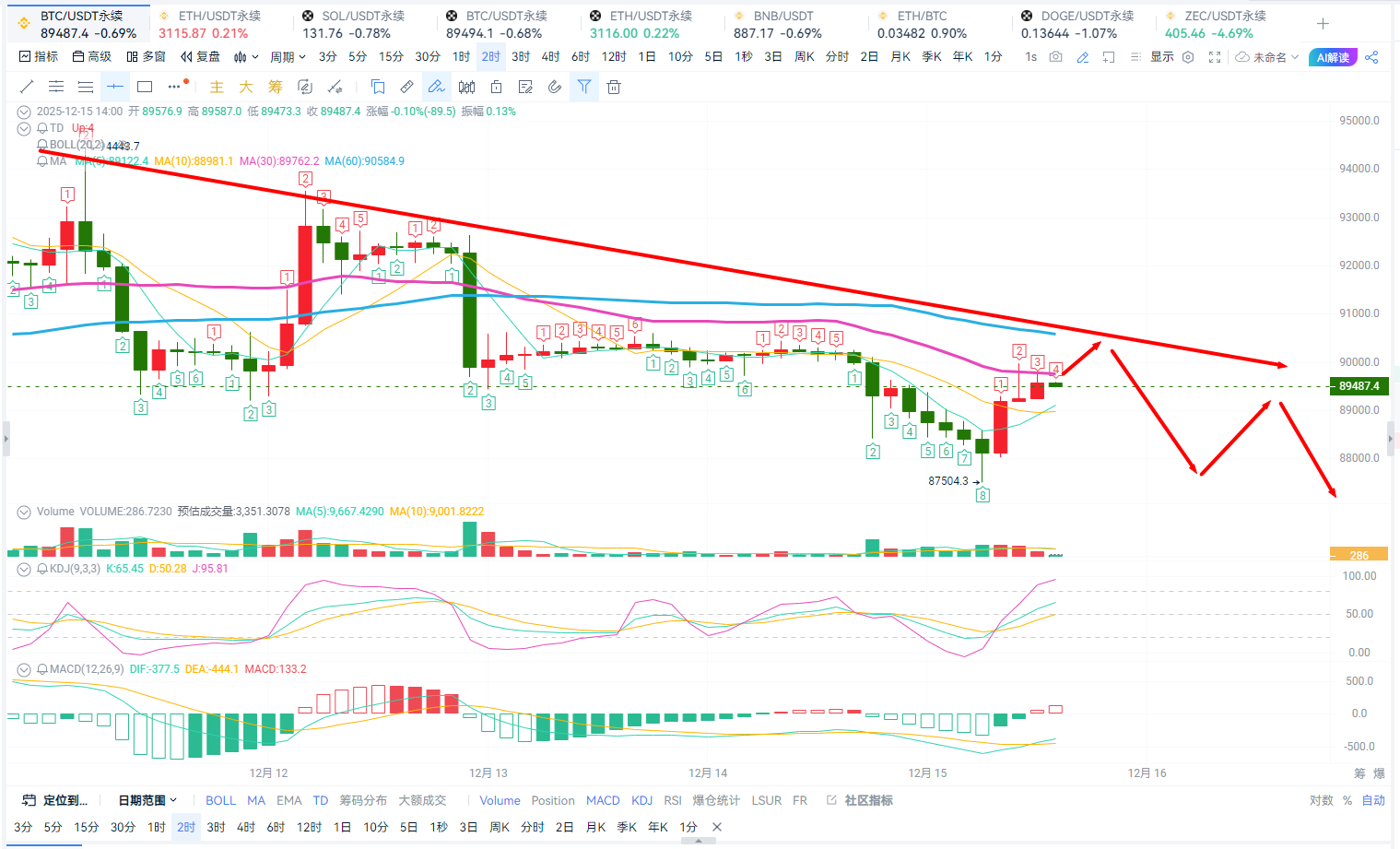 After the weekly K update, Bitcoin is currently operating near the MA5 moving average, with the K-line showing a mix of bullish and bearish arrangements. The MACD indicator remains in a bearish divergence below the waterline, while the KDJ three lines are increasingly consolidating near the bottom, intensifying the market's upward surge and downward wash movements. Additionally, the TD indicator has reached TD7, with the current key resistance level on the weekly K chart around the 94,500 line. This position is also a critical strong resistance level above, which has not been effectively stabilized for a day. In terms of the overall direction, the bearish trend still dominates.