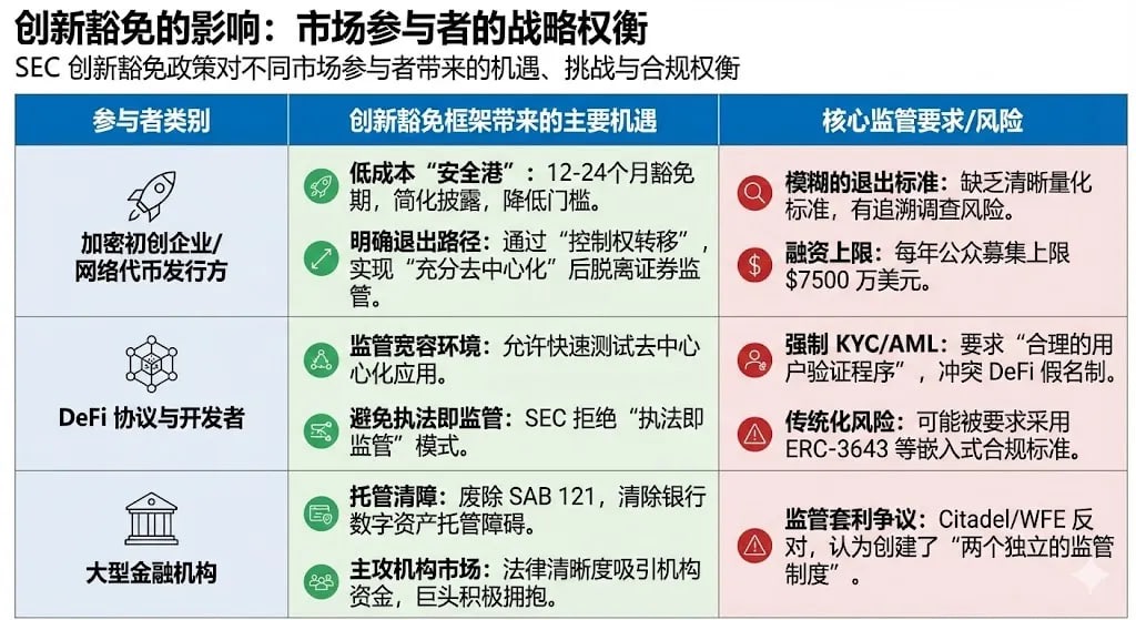 • Beneficial for Large Institutions: Traditional financial giants (like JPMorgan, Morgan Stanley) are actively embracing digital assets. The SEC's removal of SAB 121 (an accounting standard that previously forced custodians to record client crypto assets as on-balance-sheet liabilities) has removed significant barriers for banks and trust companies to scale digital asset custody services. Coupled with the administrative flexibility brought by the Innovation Exemption, these institutions can enter the crypto space with lower regulatory capital costs and clearer legal pathways.