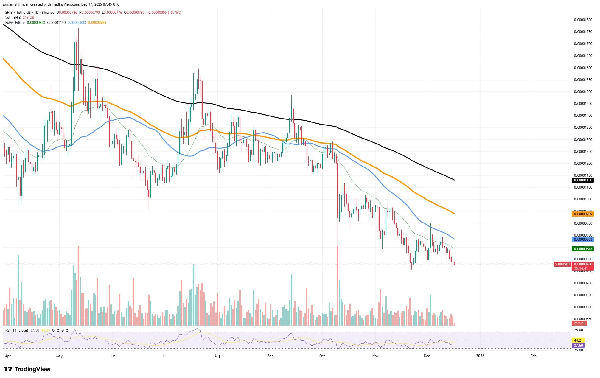 Although Shiba Inu is no longer in free fall, it would be premature to declare this to be the bottom. Currently, the chart displays stabilization rather than strength. In comparison to the October-November leg, the price has flattened following a protracted downtrend, volatility has decreased and selling pressure has obviously subsided.