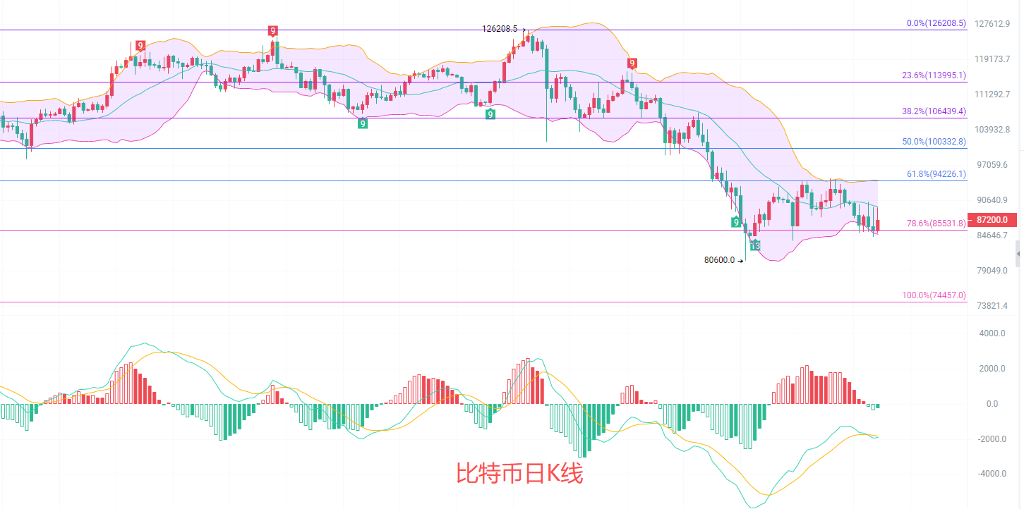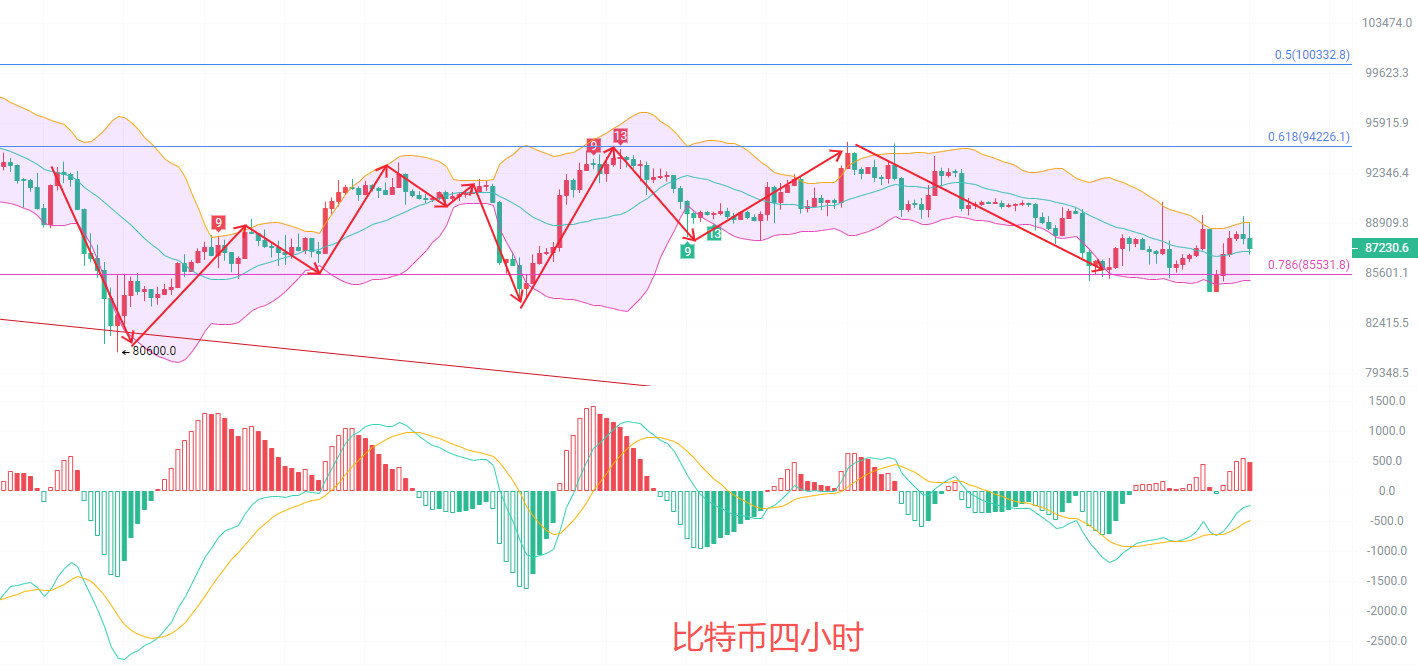 In the four-hour K-line, the maximum impact on the EMA trend top resistance at 89,500 was pushed down, breaking below the trend bottom EMA15 line at 87,155. There is a high probability of testing the golden retracement line 0.786 support at 85,500 again. Regardless of whether it will happen, it is not recommended to go south but to continue holding the chips that are moving north from 85,000. Just ensure proper defense and set stop-losses; the rest is up to time.