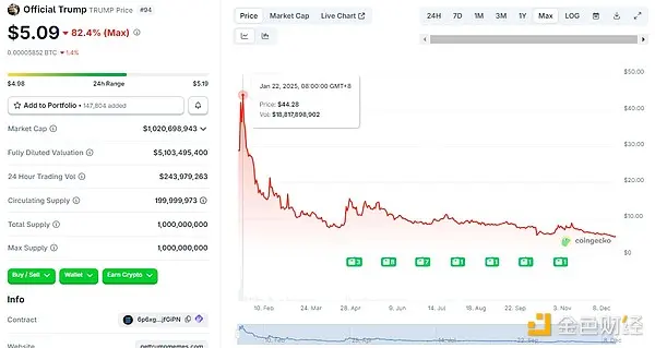 On January 18, Trump announced the launch of his personal meme coin, TRUMP. Upon its launch, TRUMP entered a skyrocketing mode, recording a peak price of over $44 on January 22, but subsequently fell, trading at $5.09 at the time of writing, down 82.4% from its January high.