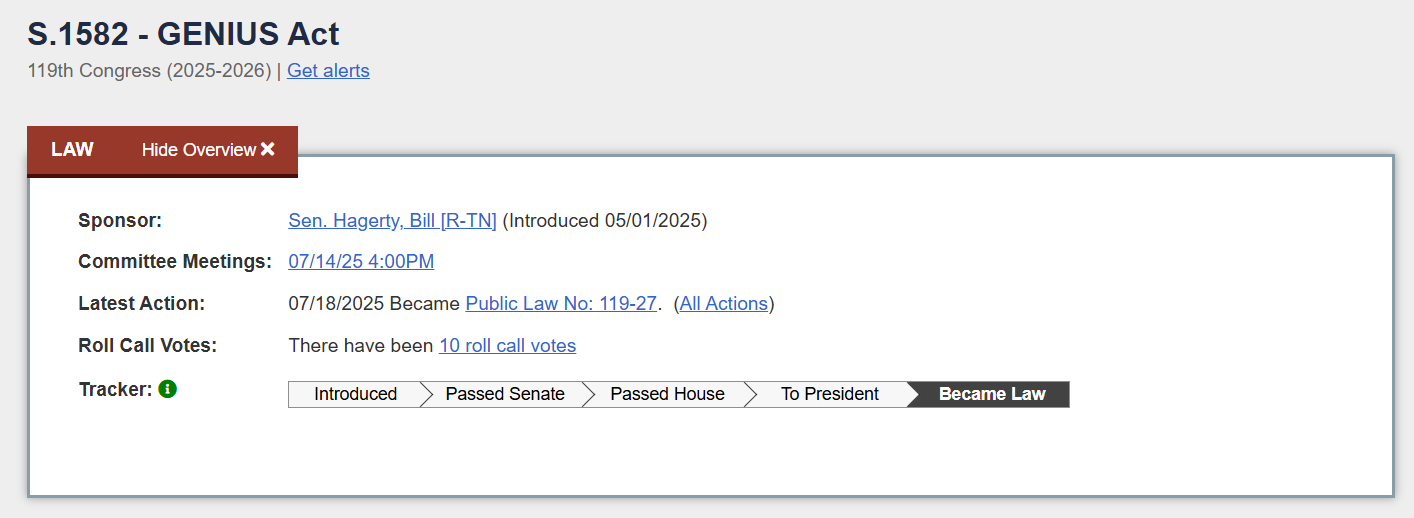 In June 2025, the U.S. Senate passed the "Guiding and Establishing National Innovation for U.S. Stablecoins Act of 2025" (GENIUS Act) with a high vote. This is the first federal-level stablecoin regulatory bill in the U.S. and became the first significant crypto legislation passed by Congress. On July 17, the House passed the bill with an overwhelming result of 308 votes in favor and 122 against. The next day, President Trump signed the GENIUS Act, making it official law. This series of rapid legislative actions reflects a bipartisan consensus on stablecoin regulation, marking a shift in the U.S. attitude towards digital dollar stablecoins from wait-and-see to active regulation.