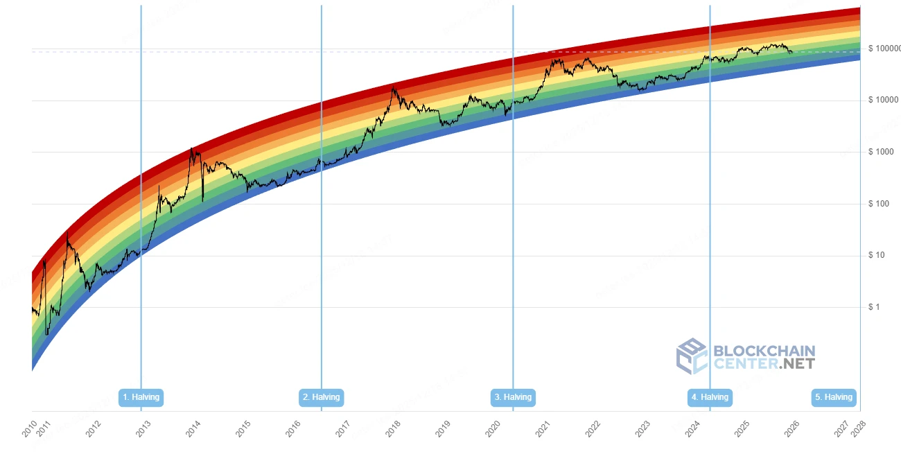 The Bitcoin Rainbow Chart uses a logarithmic growth curve overlaid with rainbow-colored bands to assess Bitcoin's long-term valuation levels.