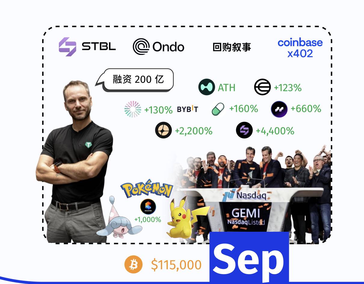 In terms of tokens, PUMP rose 160% for the month due to an aggressive buyback strategy (with over $95 million in buybacks), reaching an ATH on September 14. AVNT surged 660% after a rapid listing on both Upbit and Binance. BNB rose 19.7% after Franklin Templeton expanded the Benji platform. MNT increased 130% due to its integration into the Bybit ecosystem.