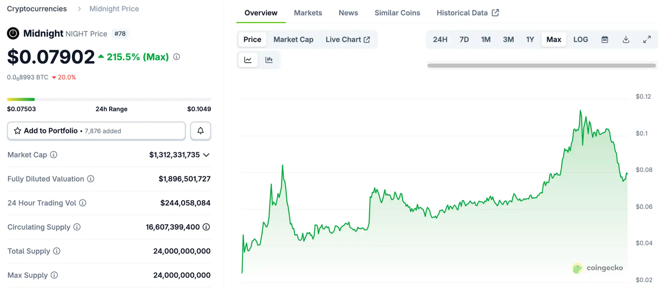 NIGHT was officially launched on December 9, and according to CoinGecko data, the token's price rose from around $0.025 to nearly $0.0114 in less than two weeks, an increase of over 3 times, with its FDV once exceeding $2.5 billion, placing it among the top 50 by market capitalization. As of the time of writing, the price of NIGHT has retreated to around $0.08.