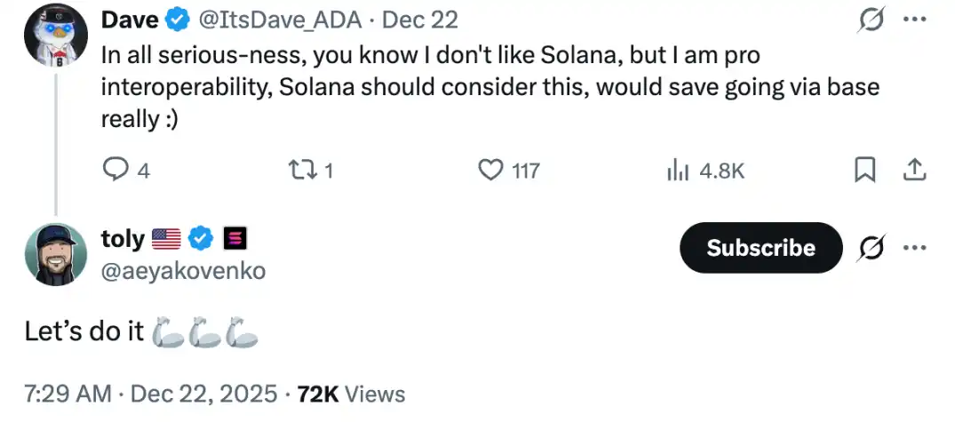 Last week, Cardano achieved atomic transactions between BTC and ADA through Fluid, not via cross-chain bridges, wrapped tokens, or centralized custody, but directly through script-to-script transactions, which is partly due to Cardano's own UTXO ledger model. Two days ago, interactions between Cardano's stake pool operators and Solana co-founders on X also confirmed this development direction.