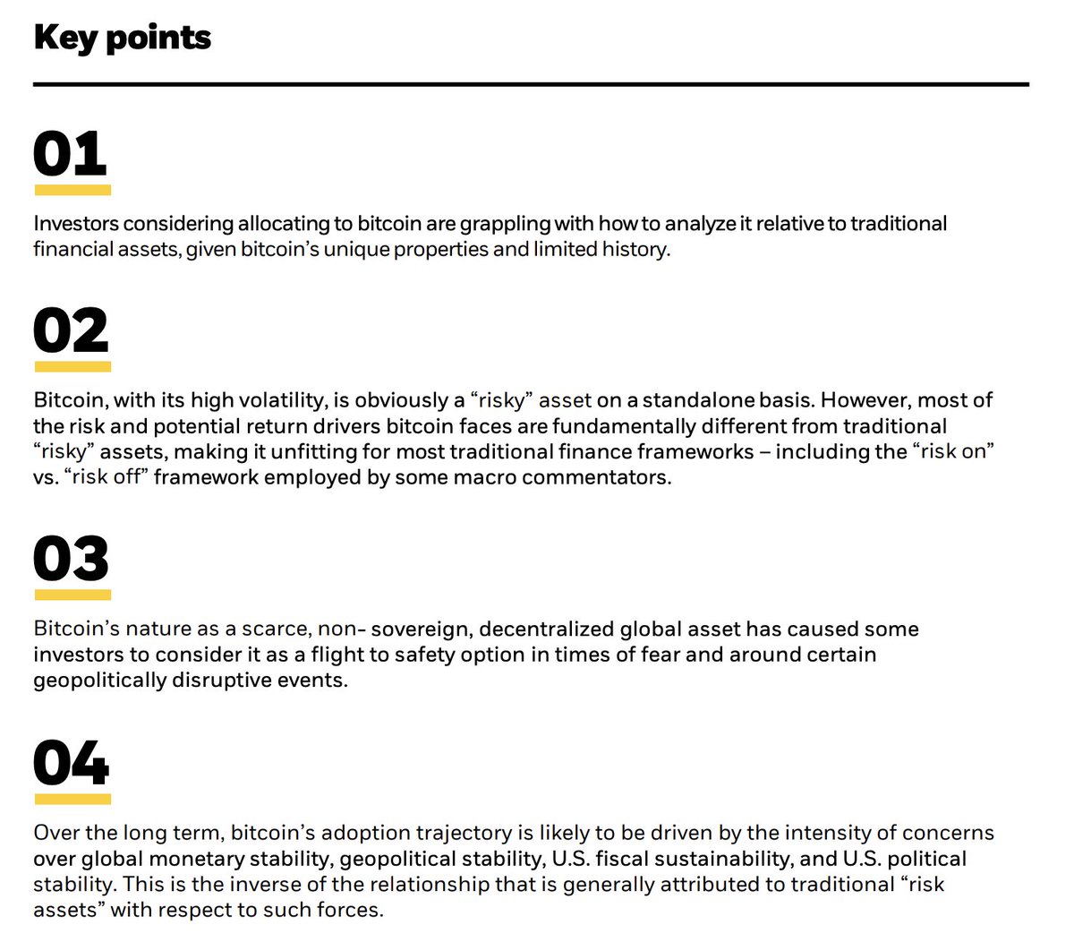 More on BTC as a unique diversifier:"Potential return drivers bitcoin faces are fundamentally different from traditional “risky” assets