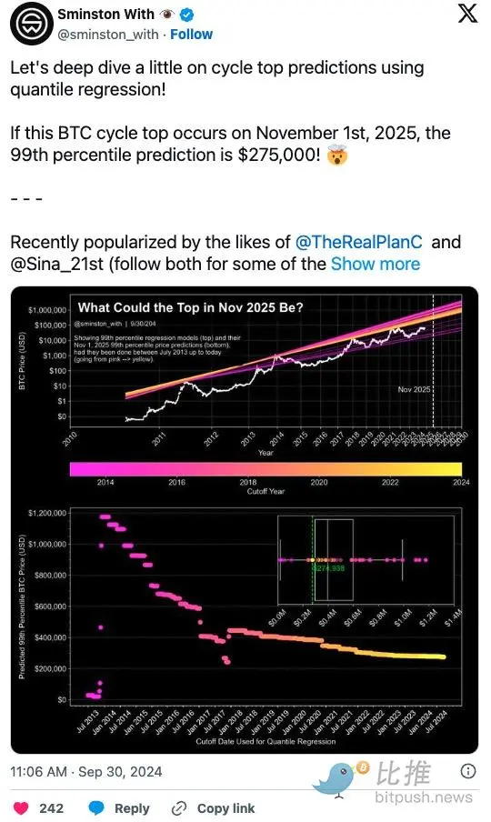 Bitcoin researcher Sminston With used quantile regression to predict the cycle top, believing it would arrive on November 1, 2025, when Bitcoin's price would reach $275,000.