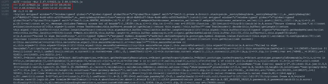 After receiving intelligence, the Slow Mist Security Team immediately began analyzing the relevant samples. Let's first look at the core code comparison between the previously released versions 2.67 and 2.68: