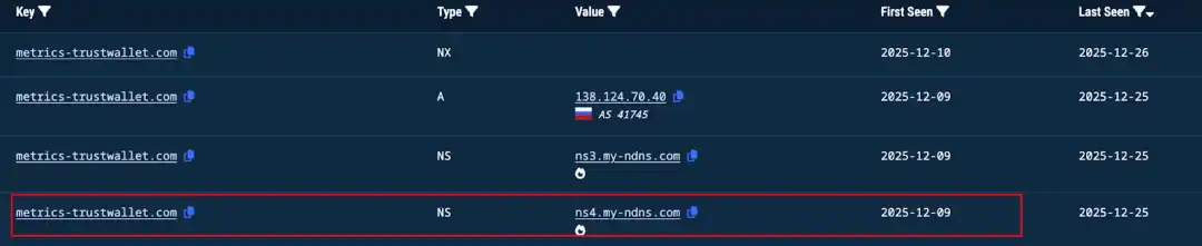 The first request record targeting api.metrics-trustwallet[.]com began on 2025-12-21:
