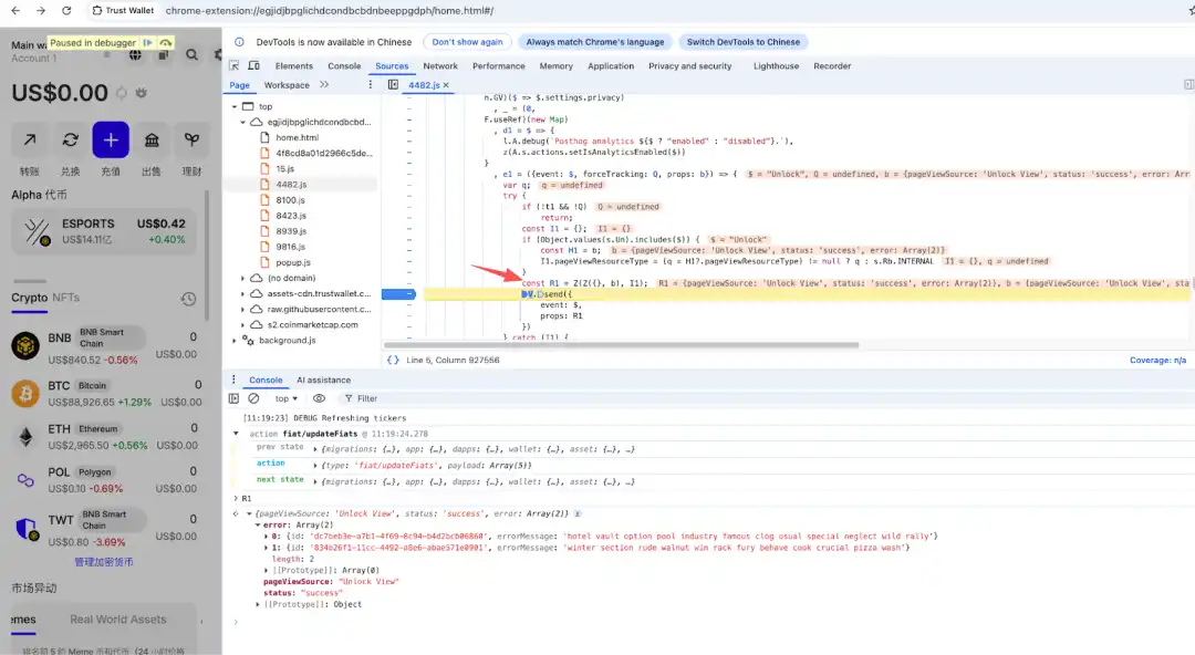 The source of this Error data is obtained through the function call GETSEEDPHRASE. Currently, Trust Wallet supports two methods for unlocking: password and passkeyPassword. The attacker obtained the password or passkeyPassword during the unlocking process, then called GETSEEDPHRASE to retrieve the wallet's mnemonic (the private key is similar), and placed the mnemonic into the "errorMessage."