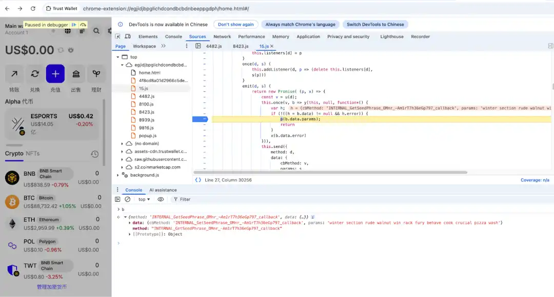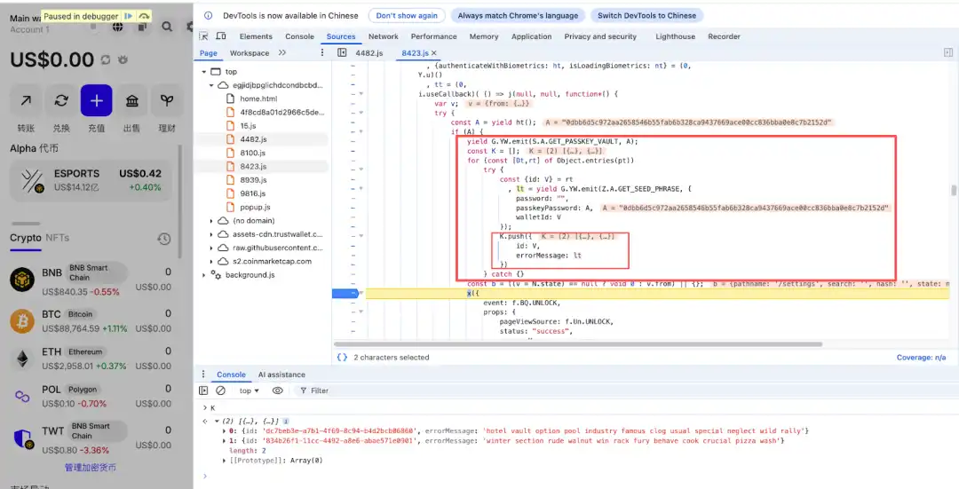 The malicious code will iterate through all wallets in the extension and initiate a "get mnemonic" request for each user's wallet to obtain the user's encrypted mnemonic. Finally, it will use the password or passkeyPassword entered by the user when unlocking the wallet to decrypt it. If decryption is successful, the user's mnemonic will be sent to the attacker's domain api.metrics-trustwallet[.]com.