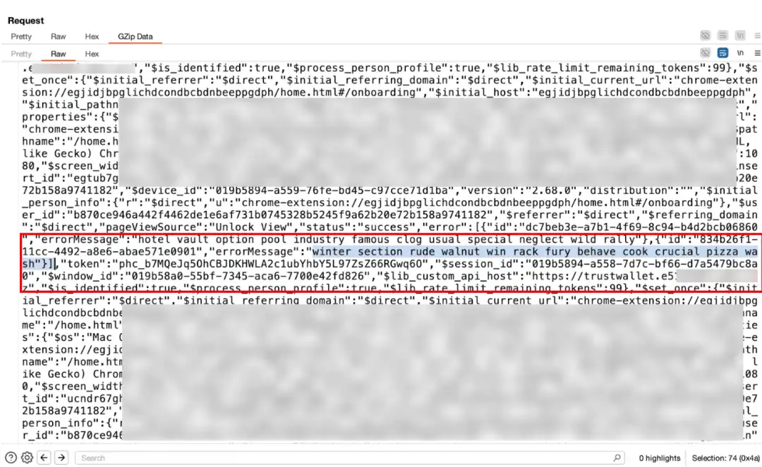Traffic analysis conducted with BurpSuite shows that after obtaining the mnemonic, it is encapsulated in the errorMessage field of the request body and sent to the malicious server (https://api.metrics-trustwallet.com), which is consistent with the previous analysis.