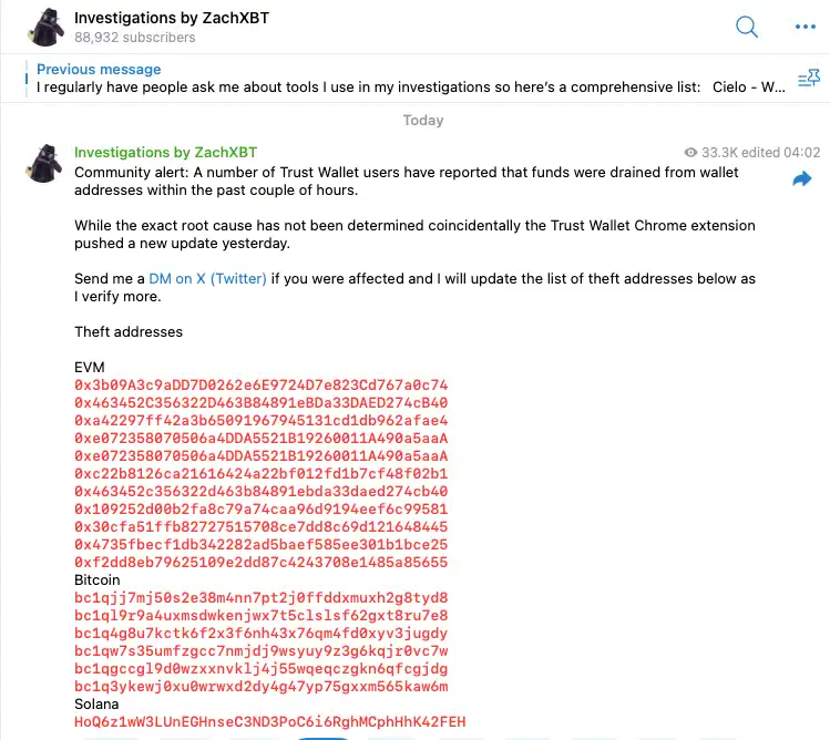 In the early hours of today, Beijing time, @zachxbt announced in the channel that "some Trust Wallet users reported that funds in their wallet addresses were stolen in the past few hours." Subsequently, Trust Wallet's official X account also released a statement confirming that version 2.68 of the Trust Wallet browser extension has a security risk, advising all users using version 2.68 to immediately disable it and upgrade to version 2.69.