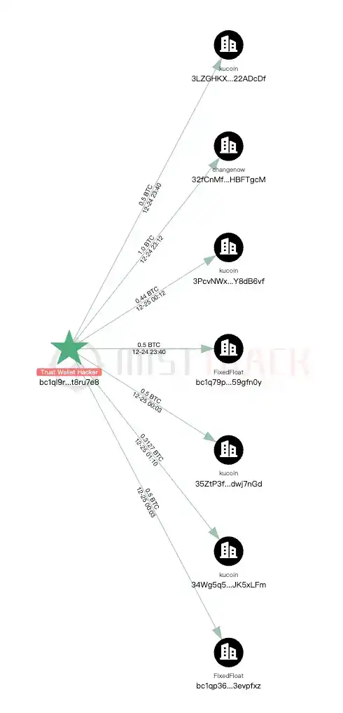 According to the hacker addresses disclosed by ZachXBT, we found that as of the time of writing, the total amount of stolen assets on the Bitcoin chain is approximately 33 BTC (worth about 3 million USD), the value of stolen assets on the Solana chain is approximately 431 USD, and the value of stolen assets on Ethereum mainnet and Layer 2 across various chains is approximately 3 million USD. After stealing the coins, the hacker transferred and exchanged some assets using various centralized trading platforms and cross-chain bridges.