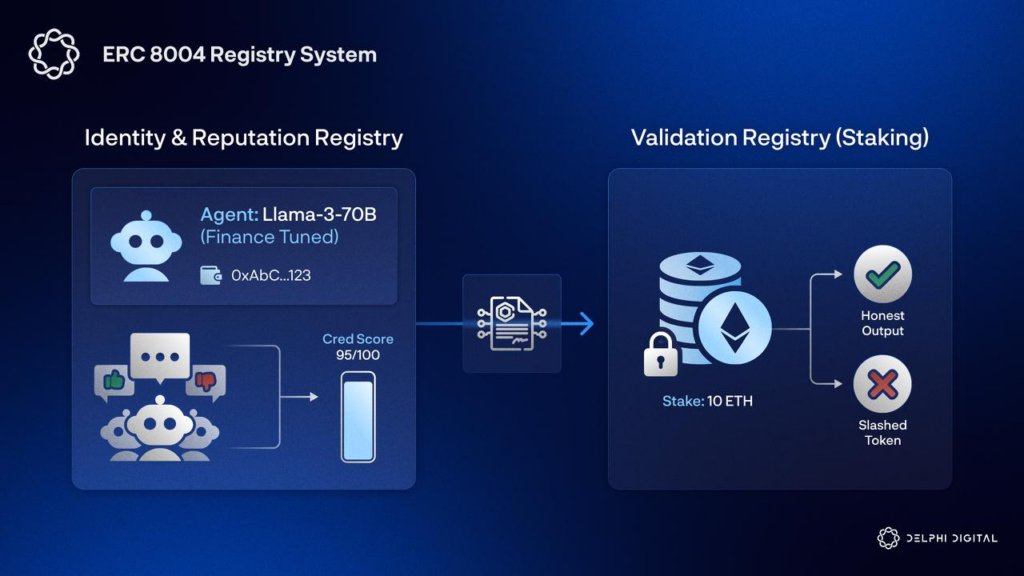 The final piece is a validation registry. An AI agent can stake ETH as collateral to prove their honesty. Agents that deliver a bad output get slashed. This brings economic consequences and aligns incentives.