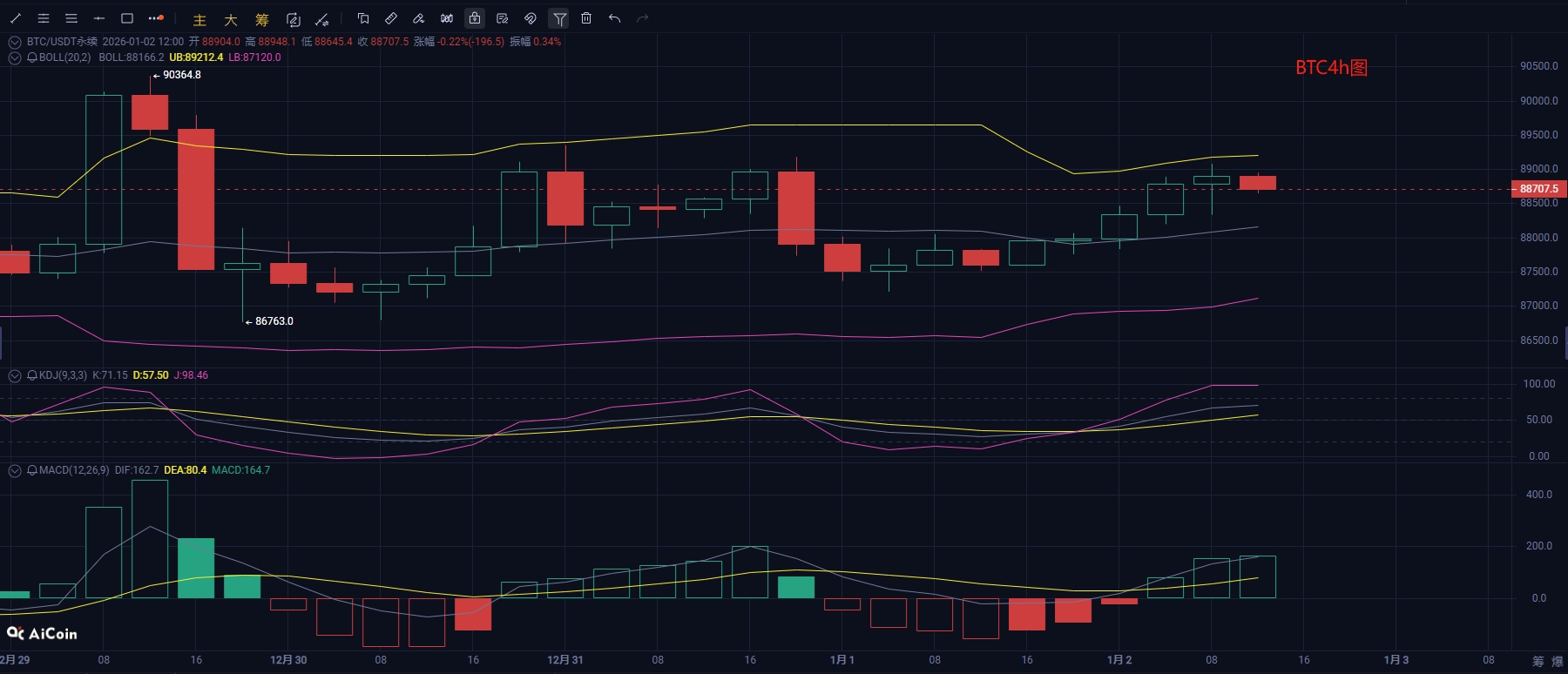 From the short-term hourly chart, the 4-hour level shows initial signals of a trend reversal, with the Bollinger Bands diverging upward. The price has risen with consecutive bullish candles touching the upper Bollinger Band before closing with a bearish candle, currently operating in the upper middle band range. The previous high of 90300 constitutes a key resistance level, while 86700 below serves as an important support level; the KDJ indicator shows K value at 71.74, D value at 57.69, and J value at 99.84, with the J line having entered the overbought zone and the three lines diverging. In terms of the MACD indicator, DIF and DEA formed a golden cross above the zero axis and continue to diverge, with the volume bars expanding. Overall, BTC is in a rebound trend at the 4-hour level, but the KDJ overbought signal suggests a potential need for short-term correction. Moving forward, it is essential to monitor whether the price can hold the support of the middle Bollinger Band; if the support holds during the pullback, the price is likely to attempt another push towards the previous high after consolidation; if the support fails, the market may retreat to the lower key support level. Therefore, intraday operations can revolve around the aforementioned key resistance and support levels for high selling and low buying.
