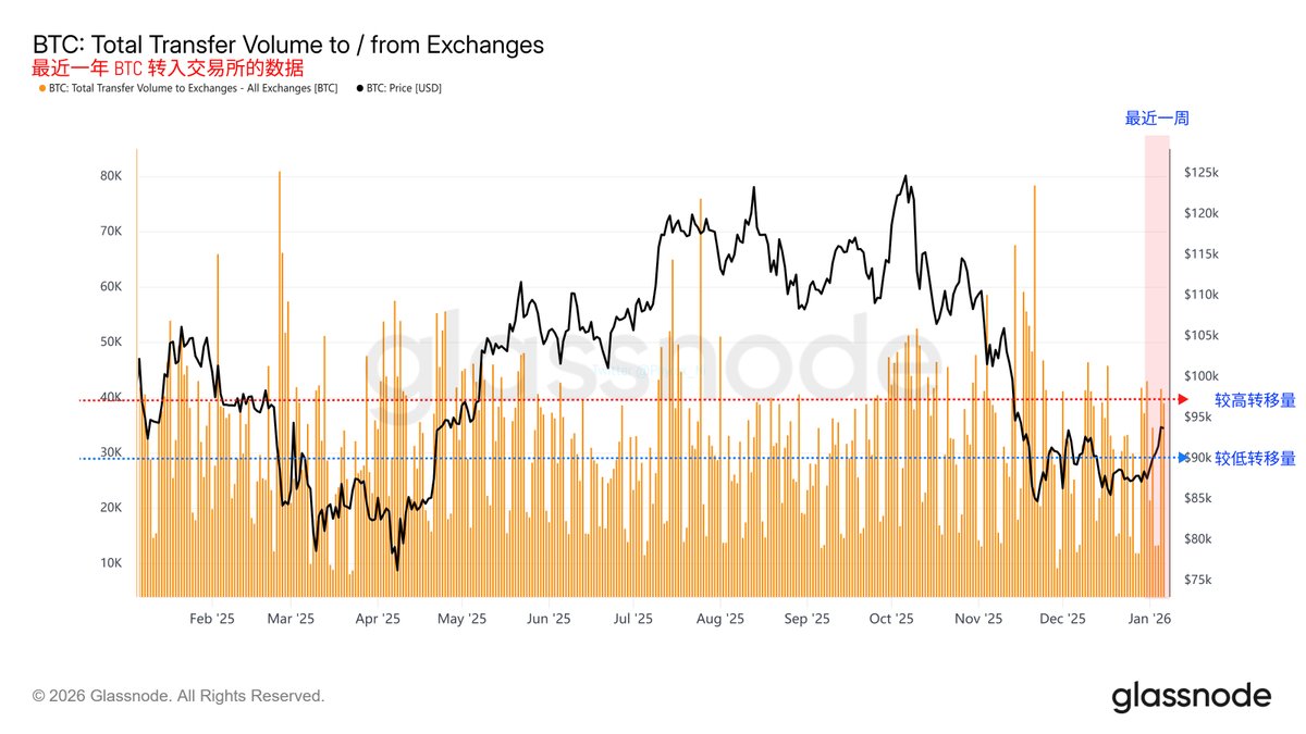 Of course, I can imagine many friends asking why there is such a significant outflow, yet the price increase is still slow or even declining. This is normal. From the detailed data on BTC inflows to exchanges, the blue line indicates a relatively low transfer volume, suggesting that investor selling sentiment is low. The red line represents a higher transfer volume, indicating that investor selling sentiment is high.