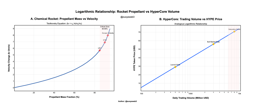 The relationship between rocket fuel and thrust is logarithmic, and the trading volume of HyperCore and the price of HYPE are also logarithmic.