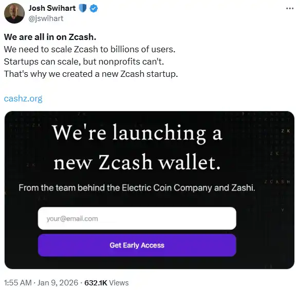 Amid this disagreement, on January 9, former ECC CEO Josh Swihart announced the establishment of a new for-profit startup, CashZ (CashZ.org), focusing on the productization and commercialization of Zcash wallets, attempting to push Zcash towards its envisioned "billion-user scale" through a sustainable profit model.