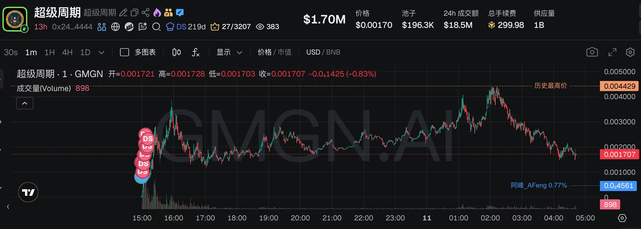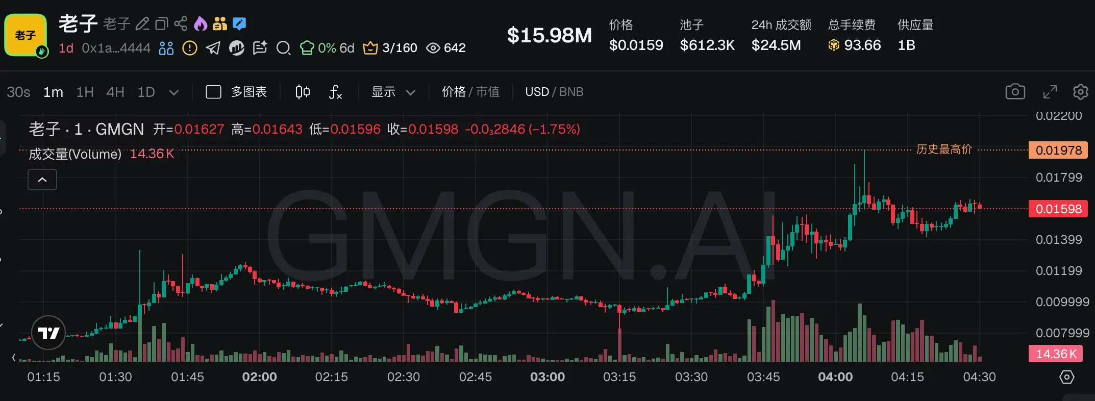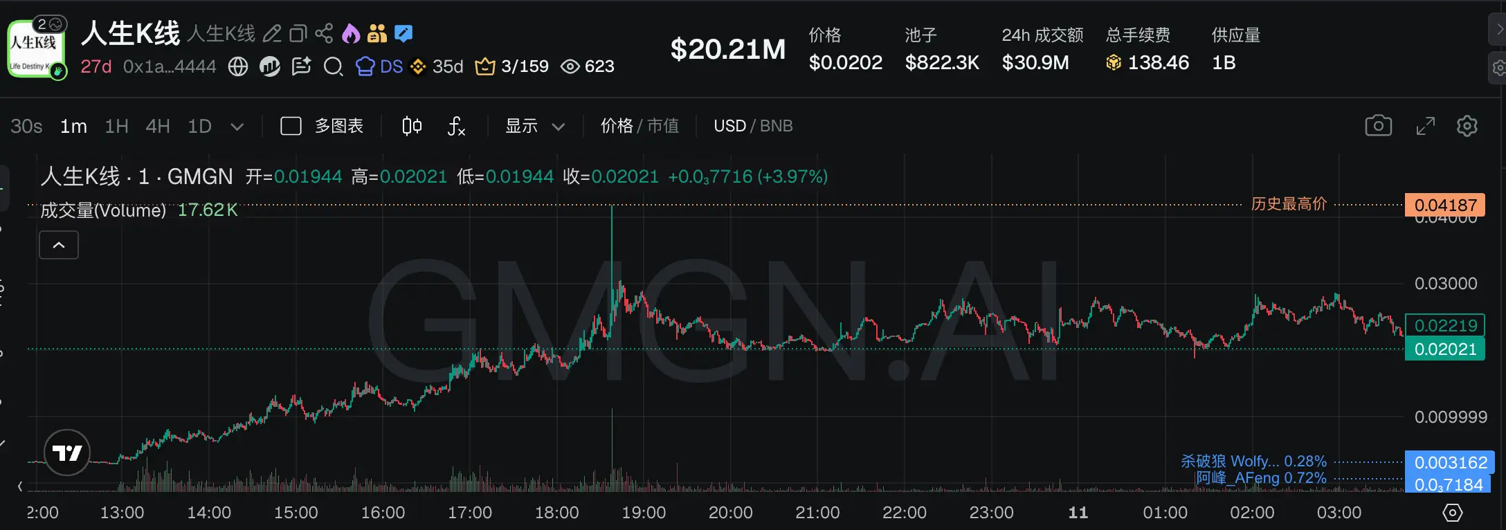 GMGN link: https://gmgn.ai/bsc/token/0x1a1e69f1e6182e2f8b9e8987e83c016ac9444444