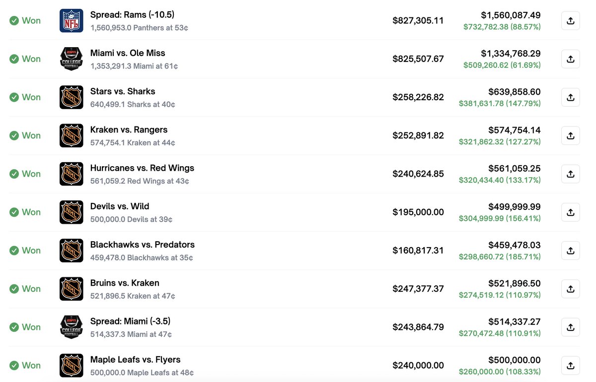 Losing trades settled at $0 (-100%).