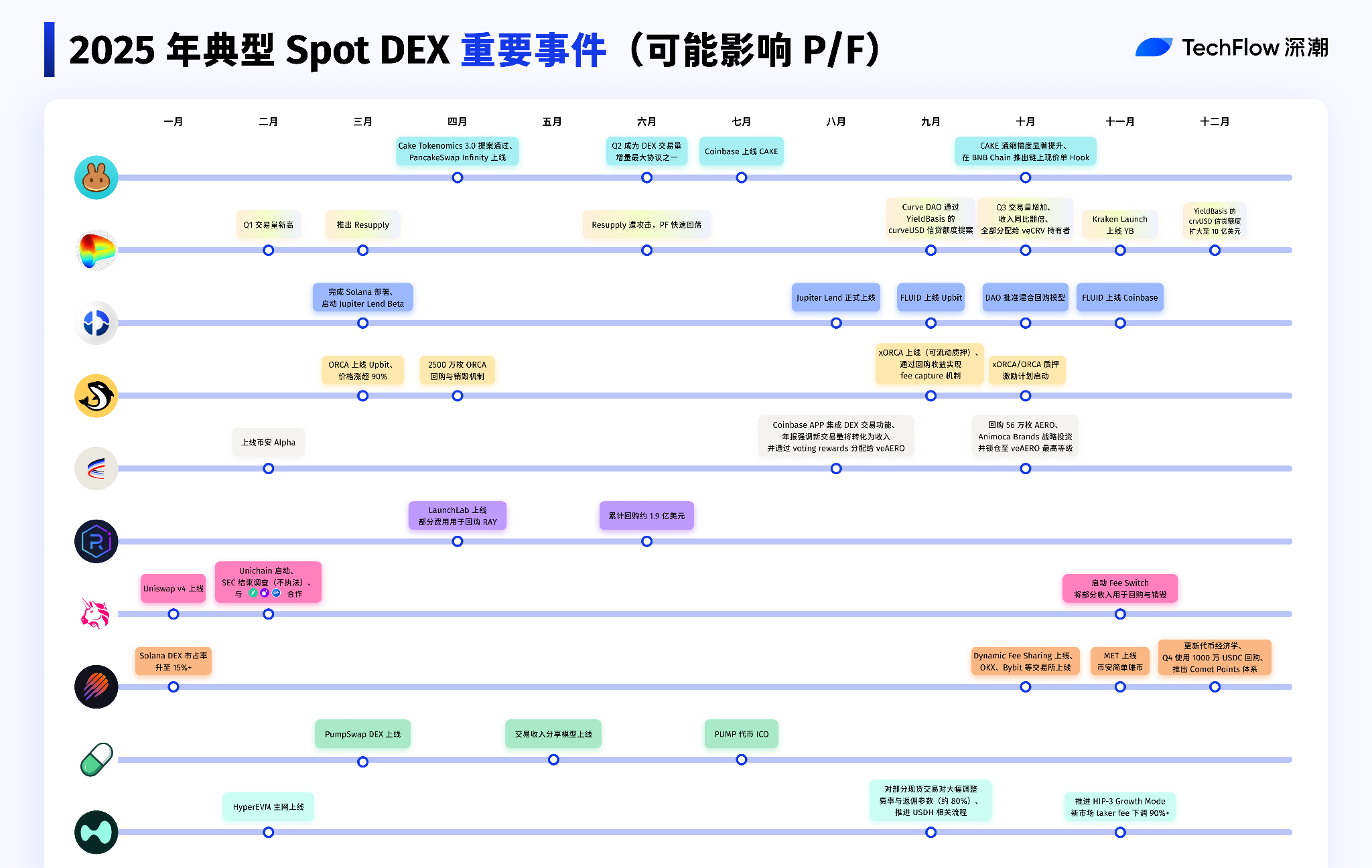 Regarding the changes in P/F for the protocols in the above chart in 2025, we have outlined important events that have had a certain impact on the P/F changes among the top ten Spot DEX, hoping to help you review this innovative and vibrant track in 2025.