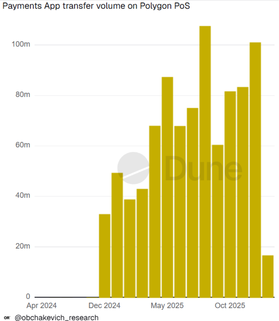 Onchain research head Leon Waidmann emphasized that this transaction range highly overlaps with daily credit card spending, indicating that Polygon is gradually becoming a major channel for payment gateways and PayFi (payment finance).