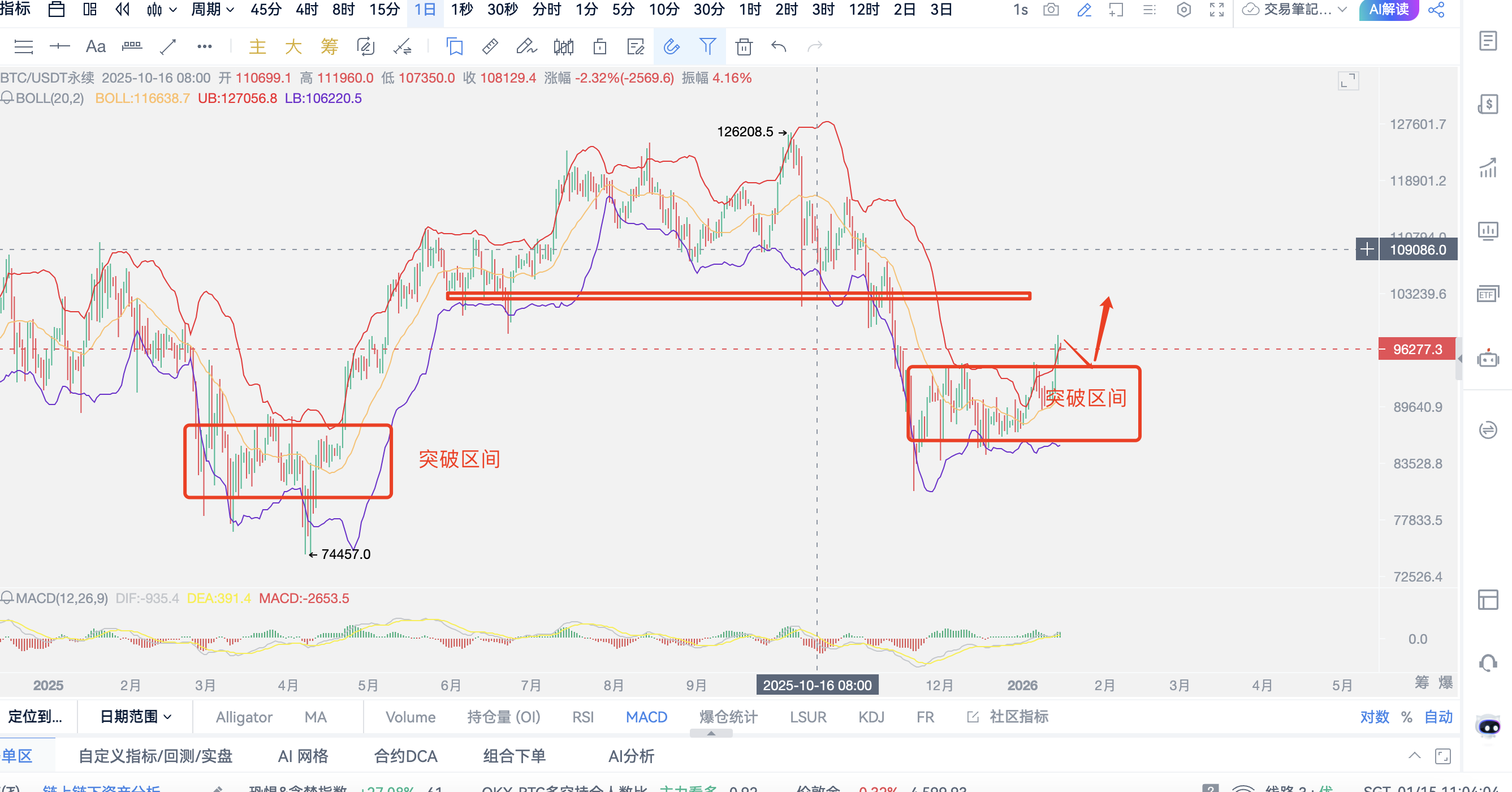 On the daily level, the price has broken through the resistance point of the range oscillation. The high point of 95,000 in 2026 has turned into a support and pressure testing point, and the upper track is also starting to open upwards, indicating that the bullish upward space is opening up. Therefore, the next stage is expected to reach the 100,000 mark.