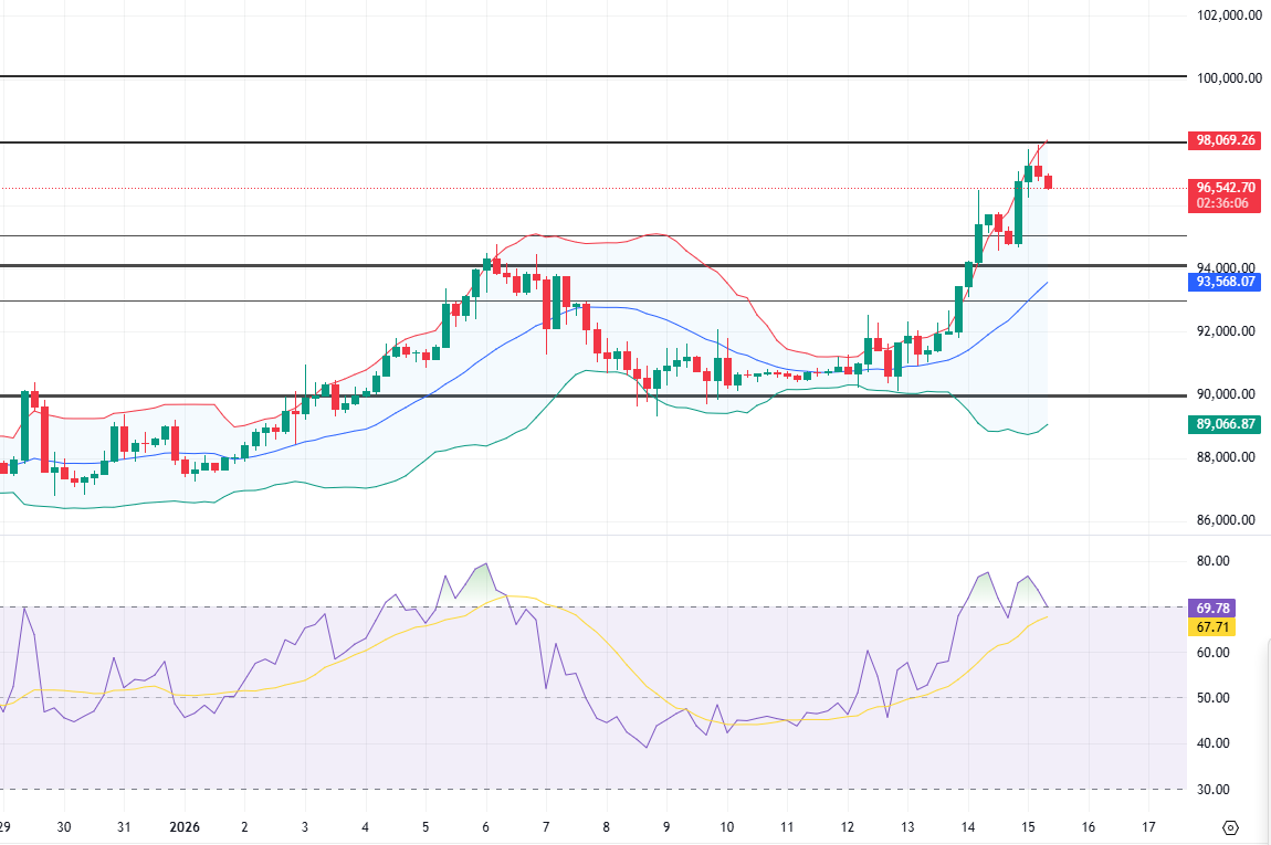 On the technical front, Bitcoin quickly surged after breaking the upper boundary of the previous consolidation range, but structurally, it leans more towards an emotional rally following a breakout rather than the initiation of a trending market. Although the daily moving averages have turned upward, they remain within a mid-term consolidation range; the four-hour RSI has entered a clearly overbought zone, and momentum is beginning to slow; hourly indicators have turned and entered a corrective state, indicating a demand for profit-taking in the short term. The current price is approaching the important psychological and technical resistance zone of 98,000–100,000, which has historically been a key area for institutions and medium-term funds to reduce positions, so caution is warranted for concentrated selling pressure at high levels.