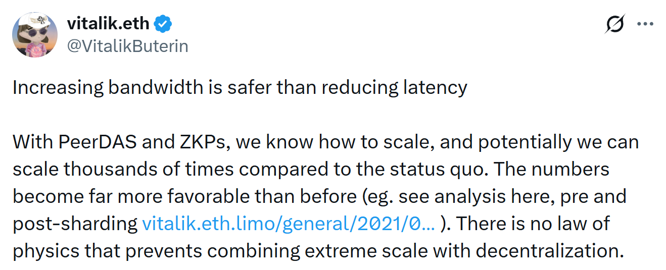 However, looking back from the beginning of 2026, we find that it seems to be gradually transforming into a "design threshold" that can be crossed through technological evolution. As Vitalik Buterin pointed out in a disruptive perspective on January 8: "Compared to reducing latency, increasing bandwidth is safer and more reliable. With the help of PeerDAS and ZKP, Ethereum's scalability can be increased by thousands of times without conflicting with decentralization."