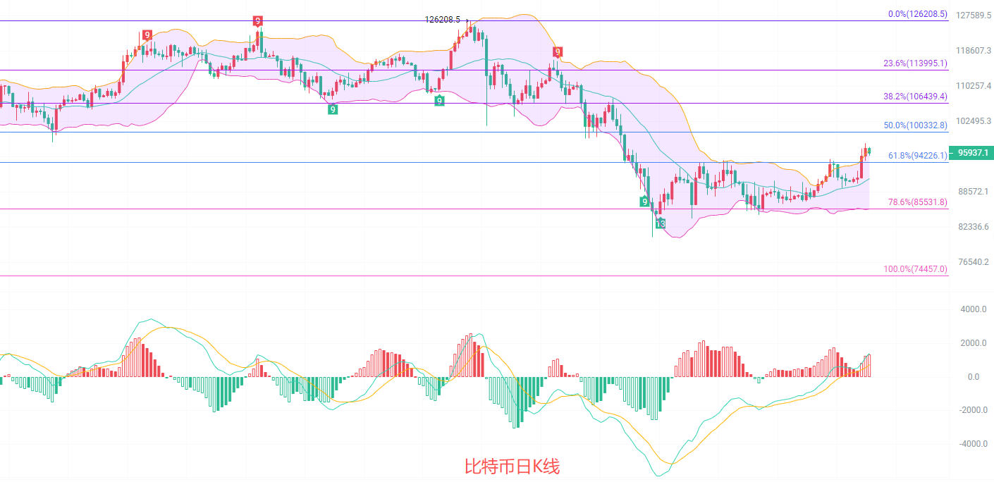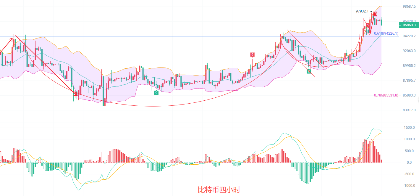 Before the article was published, the highest price was 97,150, and the lowest was 95,400. The EMA trend indicator still shows a bullish trend, with mid-line support remaining at 94,000. The MACD has been continuously increasing, and there is a slowdown in the upward expansion of DIF and DEA. The EMA60 trend support is at 95,200, combined with the Fibonacci retracement level of 0.618 support, providing a double support at the bottom, giving several entry opportunities for the upward movement. The upper Bollinger Band is at 96,600. Currently, the K-line has returned to the channel, but the trend remains bullish.