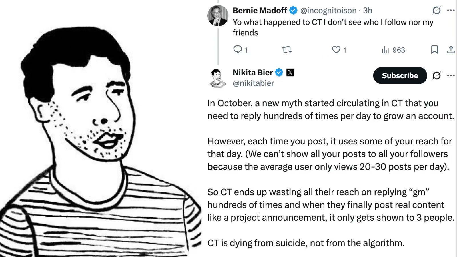 Just recently, he criticized the trend of crypto tweets heading towards self-destructive extinction. Nikita stated that since last October, there has been a notion circulating in CT that users need to reply hundreds of times daily to achieve account growth; however, each post consumes part of the day's influence. Since ordinary users only browse 20 to 30 posts daily, the platform cannot display all of a user's posts to all their followers, leading crypto Twitter users to waste all their influence on hundreds of "gm" replies, with only a few people paying attention when they post substantial content like project announcements. The decline of crypto tweets stems from their own behavior rather than algorithm issues.