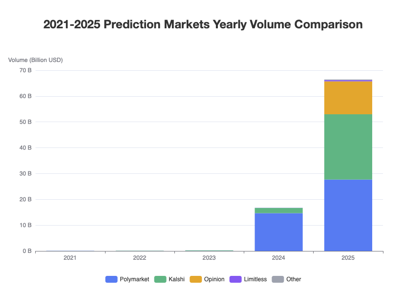 Data doesn't lie. Polymarket's total flow in 2024 was approximately $14.6 billion, and by 2025, this number soared to $27.6 billion. The entire sector's capital volume doubled within a year, and prediction markets are no longer a niche toy.