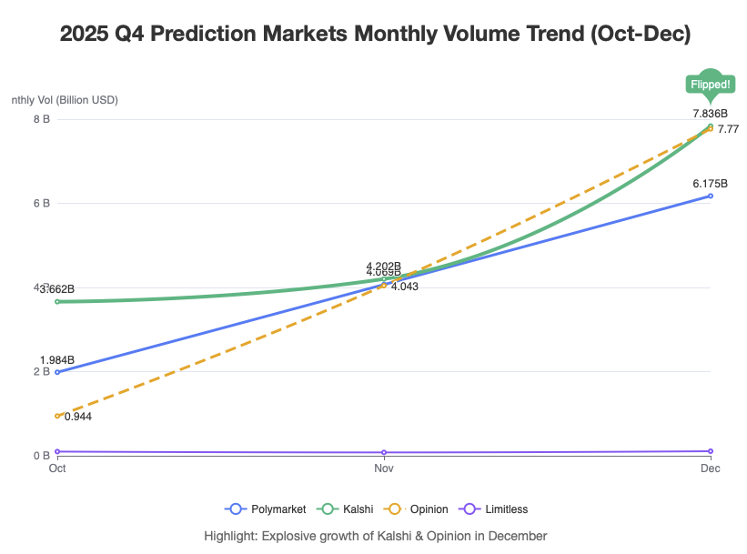 However, in just three months in Q4, it achieved a terrifying growth from $0 to a monthly flow of $7.7 billion, and in December's data, it nearly matched Kalshi, leaving the old giants behind.