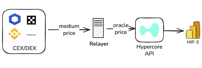 Builders often deploy relayer nodes for price feeding, where oraclePx is calculated by the relayer combining external price sources; markPx is calculated by the relayer's custom algorithm; externalPerpPx comes from the weighted median of perp mid prices from multiple CEXs.