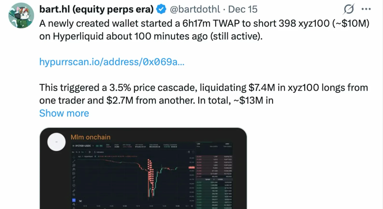 On December 14, 2025, the XYZ100-USDC (benchmarking NASDAQ100) on trade.xyz was manipulated, with attackers creating a short position of 398 XYZ100 (~10M USDC), causing a severe price dislocation, leading to the liquidation of many long positions, which in turn caused the price to continue to drop, ultimately resulting in ~13M USDC of long positions being liquidated.