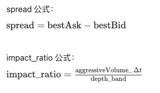 spread = bestAsk - bestBid: The price difference, used to measure whether the order book is "broken"