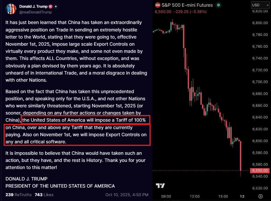 October 10 - Trump threatens 100% tariffs on China