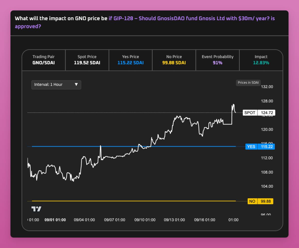 In this Gnosis vote, the market priced YES at 115 vs NO at 99, meaning GNO would pump 13% if the proposal passed.