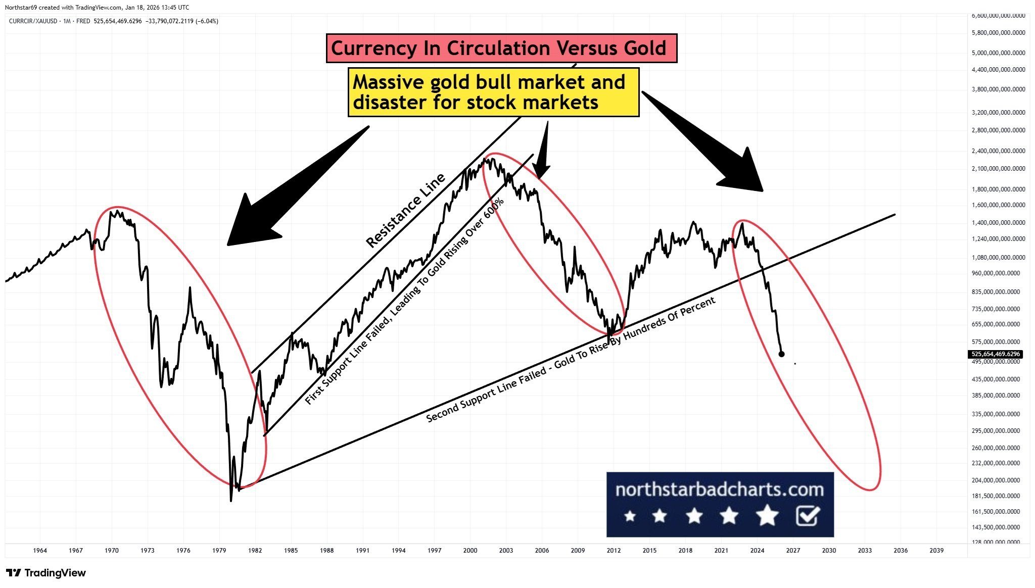 The chart examines currency in circulation relative to gold across several decades, highlighting repeated cycles where prolonged fiat expansion ultimately failed at key technical levels. Annotated breakdowns show that initial support failures were followed by gold advances exceeding 600%, while deeper structural breaks preceded even larger percentage gains. Red circled zones mark periods of currency weakness relative to gold that often aligned with equity market stress. The most recent segment suggests another breakdown phase, pointing toward a renewed gold bull market if historical symmetry holds.