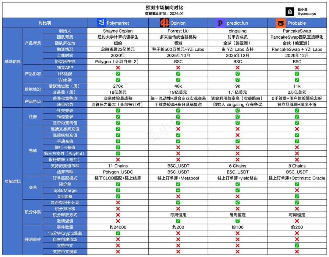 After comparing the basic information of the four projects, we can take a closer look at the functional comparisons of these four platforms. I have divided it into several modules, which include the user journey: registration, deposit, trading, as well as a points system and specific prediction events.