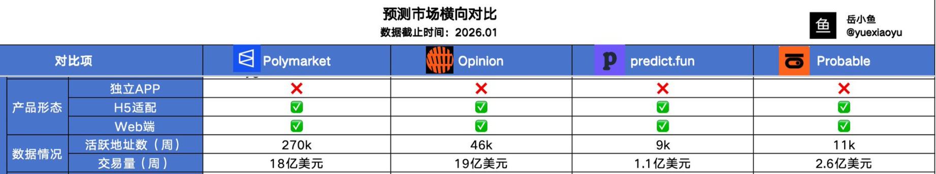 First is Polymarket, which has reached 270K weekly active addresses, with a trading volume of $1.8 billion and an average transaction volume of $6,666.