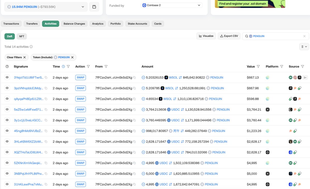 Trader 7fFCzx spent $54K to buy 15.94M $PENGUIN($793K now) 2 days ago and is now sitting on an unrealized profit of $739K.