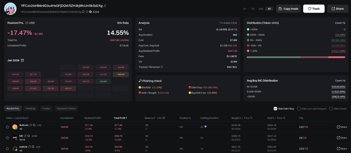 He has traded over 1,000 tokens in total, with a win rate of only 14.55%.