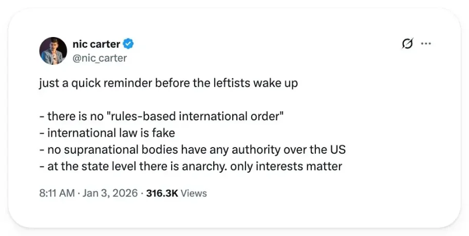 Trump believes that this "rules-based international order" exists solely because the United States allows it to exist. As the strongest nation with the most powerful military, this means we are the true architects of this "rules-based international order," and Trump's "America First" philosophy signifies that he no longer wishes to coexist amicably with other countries.