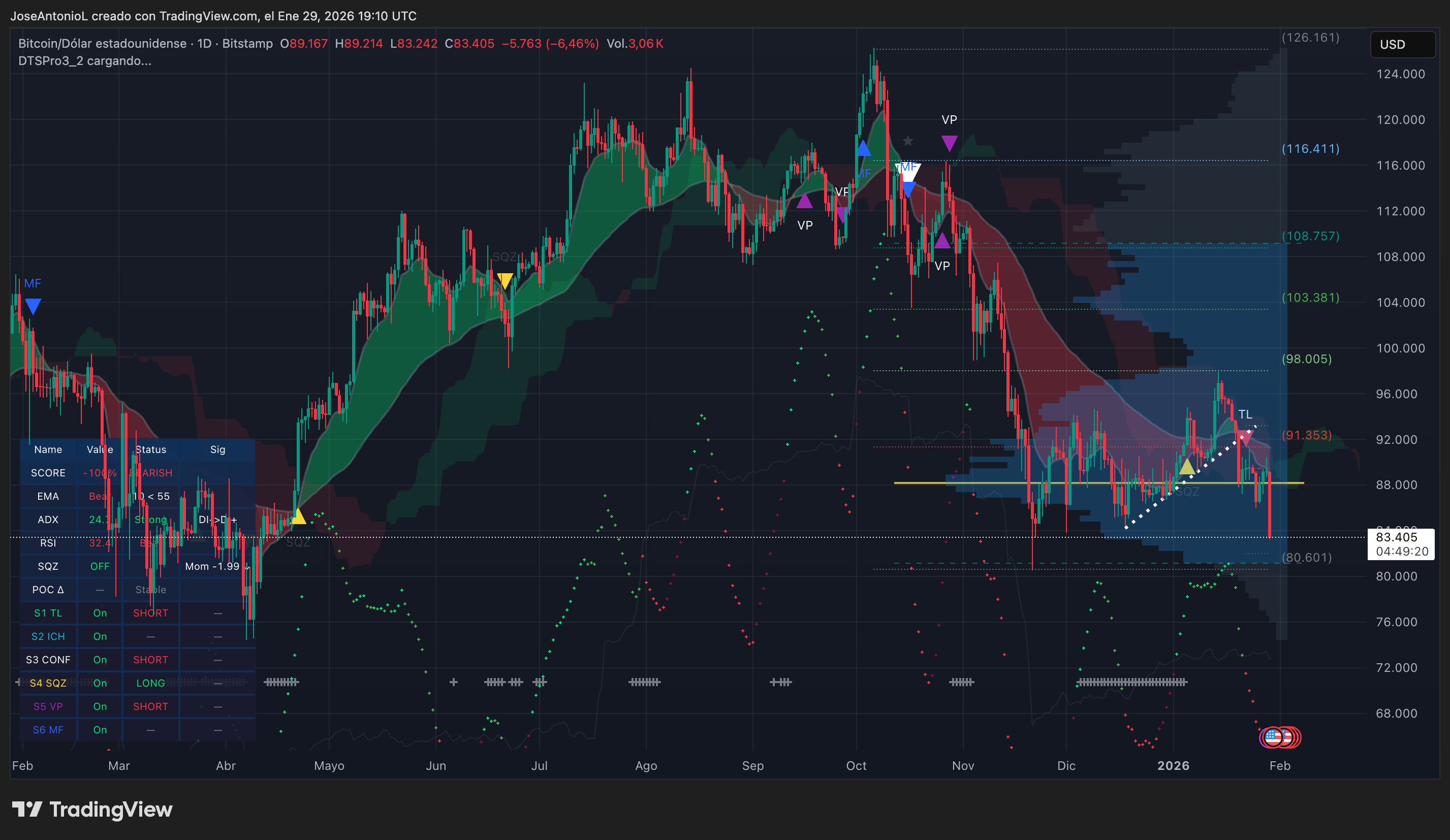 Bitcoin was recently trading at $83,405, down 6.46% or $5,763 from yesterday's levels. The price has sliced through multiple support zones on its way down from January's high near $97,000, and the technical picture suggests this isn't over yet.