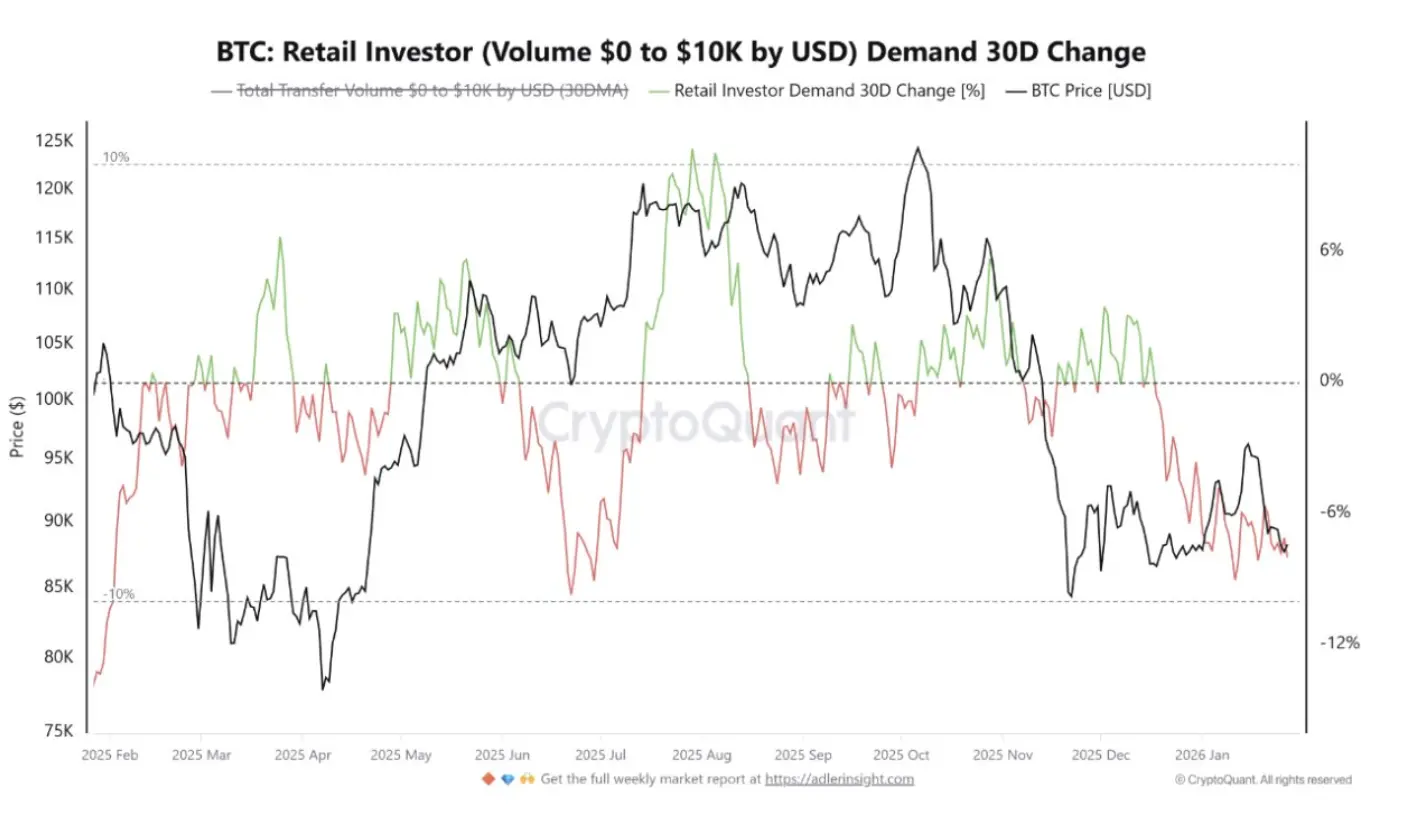 At the same time, retail investors are also withdrawing. On-chain data shows that small transactions of $0 to $10,000 have sharply declined over the past month, with not only buying slowing down but also a significant decrease in the number of participants. When ETF buying disappears and retail investors exit, the market is left with only short-term traders and leveraged speculators, inevitably amplifying volatility.