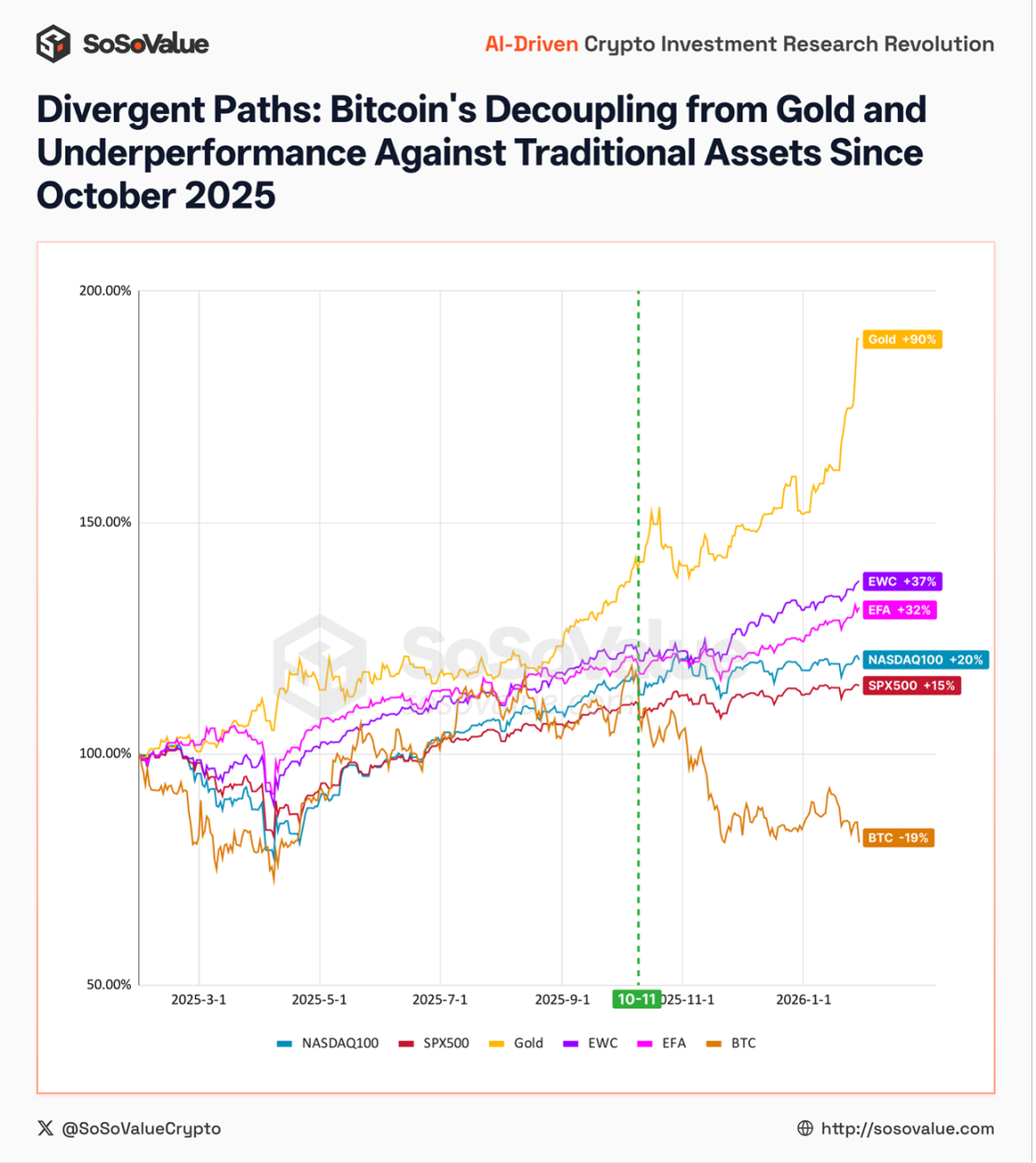 Figure 1: Since October 2025, Bitcoin has underperformed traditional assets and decoupled from gold trends, data source: SoSoValue
