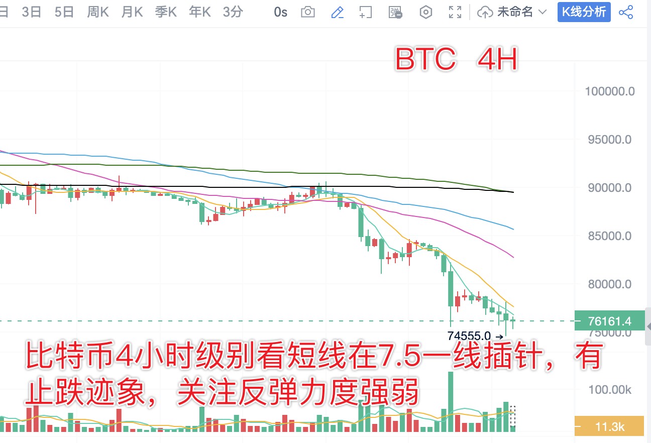 From the daily chart of Bitcoin, the downtrend has slightly eased, breaking the low level of 7.45 again. The monthly chart focuses on the MA30 moving average at the 7.7 level. From the 4-hour chart, there have been two consecutive spikes near the 7.5 level. If the short-term can stabilize at the 7.5 level, this round of one-sided decline is expected to end, leading into a rebound phase. Personally, I judge that the recent decline is about to end, and one can prepare to build long positions in batches at ultra-low levels, looking for a large-scale rebound.